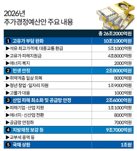 정부가 2026년 3월 31일, 총 26조 2,000억 원 규모의 추가경정예산안을 발표하며 고유가피해지원금을 전격 편성했습니다. 이번 예산안 중 유가 부담 완화에 10조 1,000억 원이 쓰이며, 이 가운데 4조 8,000억 원이 본 정책에 투입됩니다.